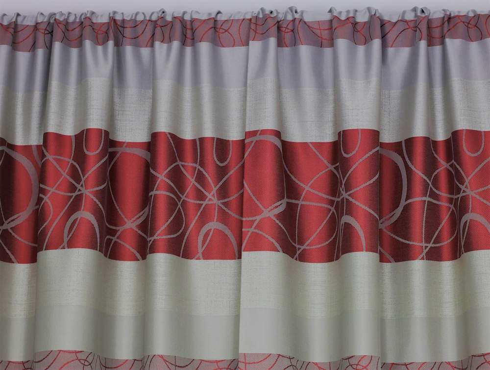 Látka je tkaná oboustranně, vzor pruhů a ornamentů šedé a temně červené barvy, šíře 155cm.
