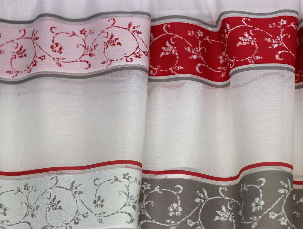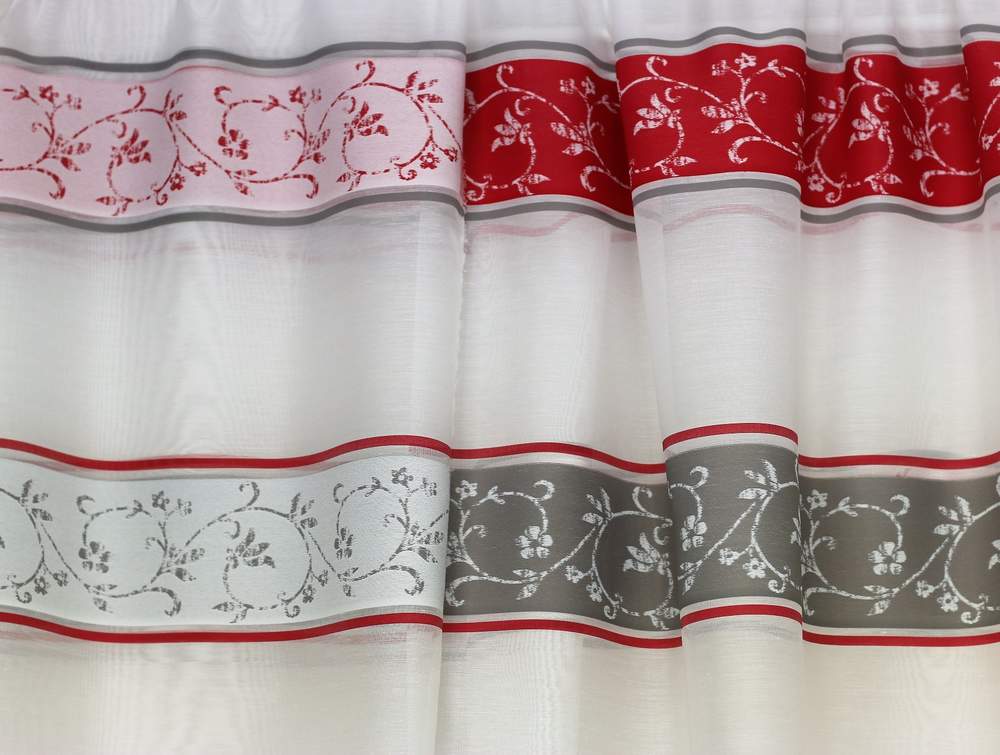 Látka je oboustranná, bílý voál s červenými a hnědo-šedými pruhy , šíře 140cm.