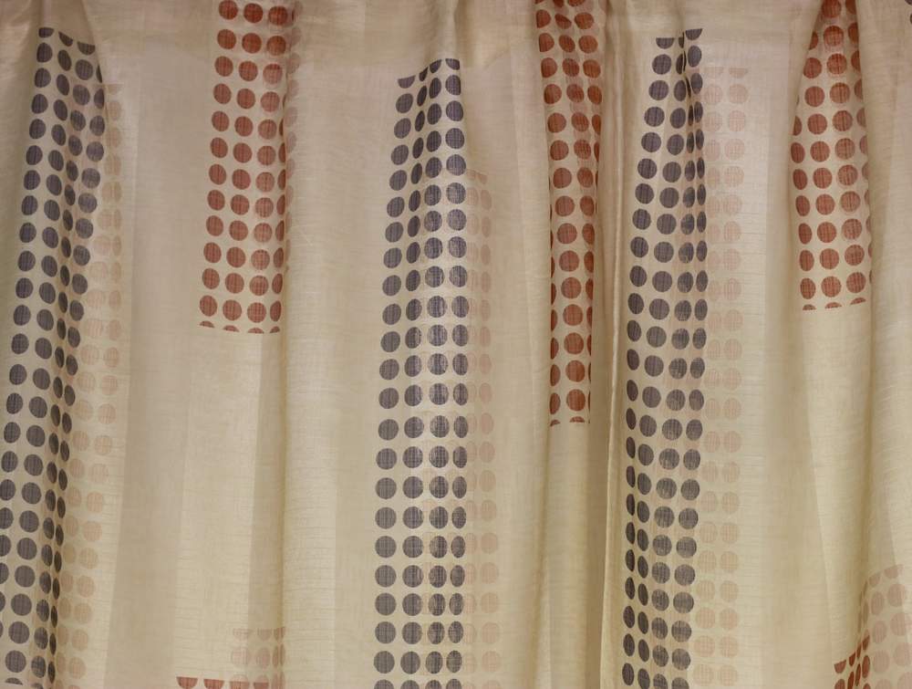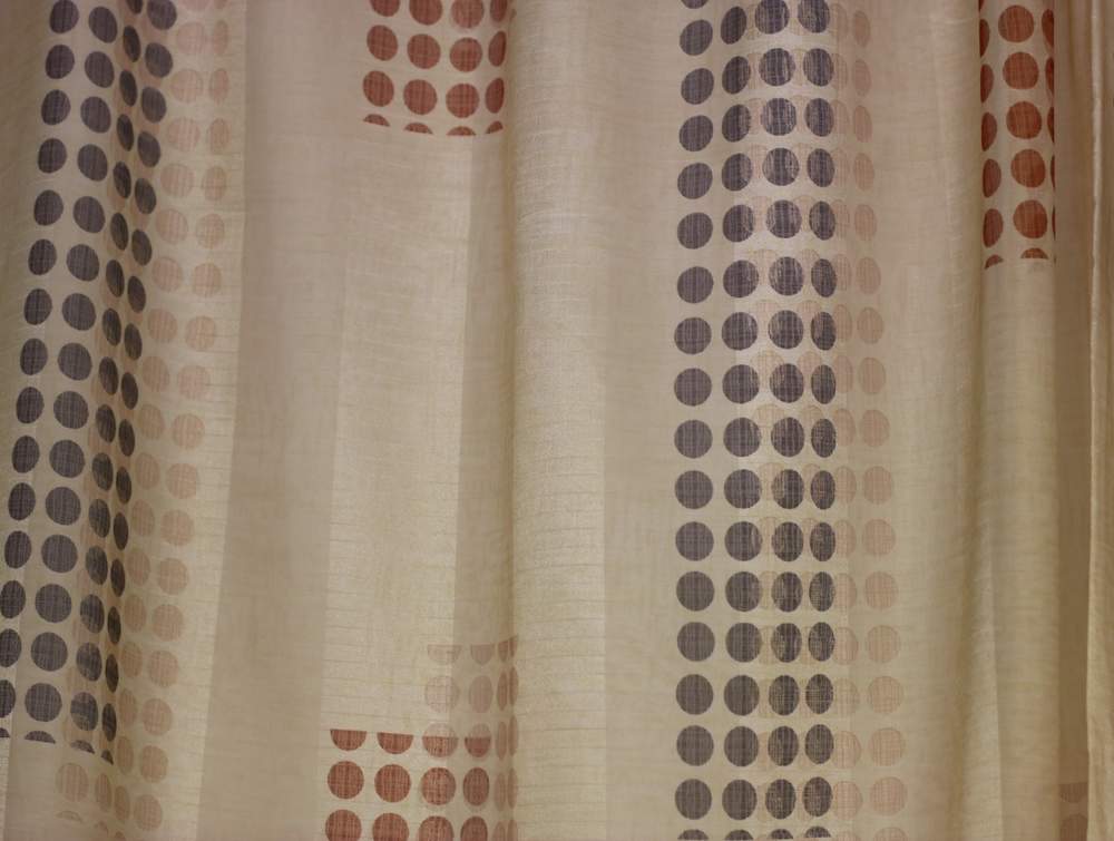 Látka je jednostranná, béžový podklad, kroužky hnědé a cihlové barvy,