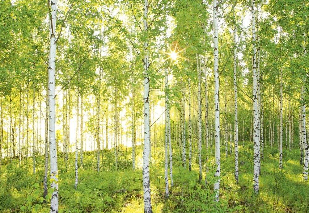 Slunečné nedělní ráno v březovém lese.