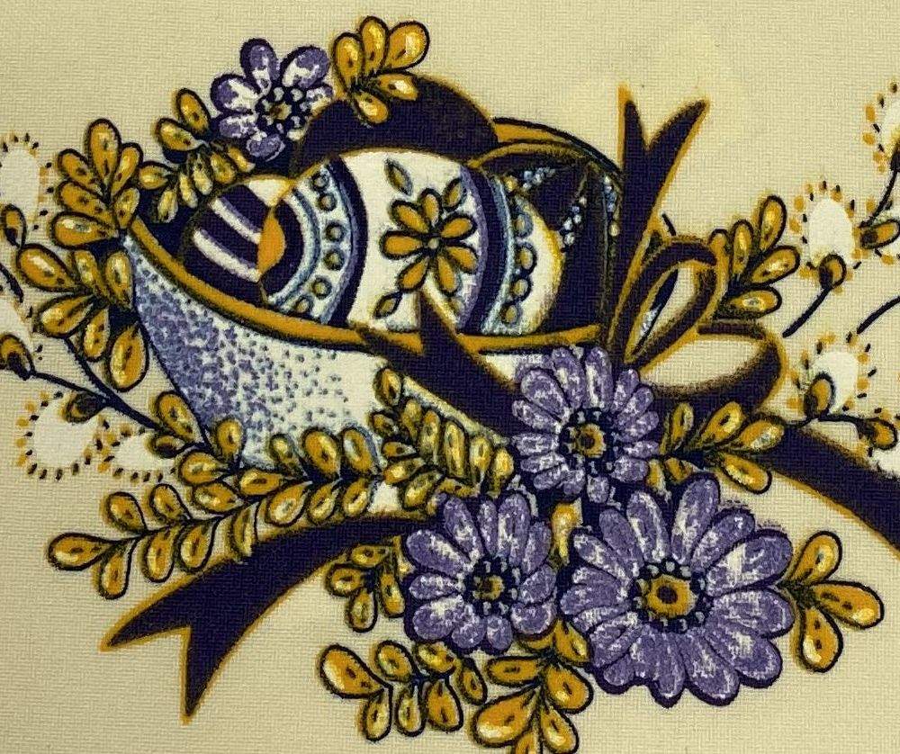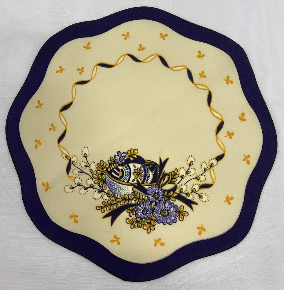 Velikonoční kulaté prostírání, smetanová barva s tmavě fialovým lemem, s vajíčky a kytičkami