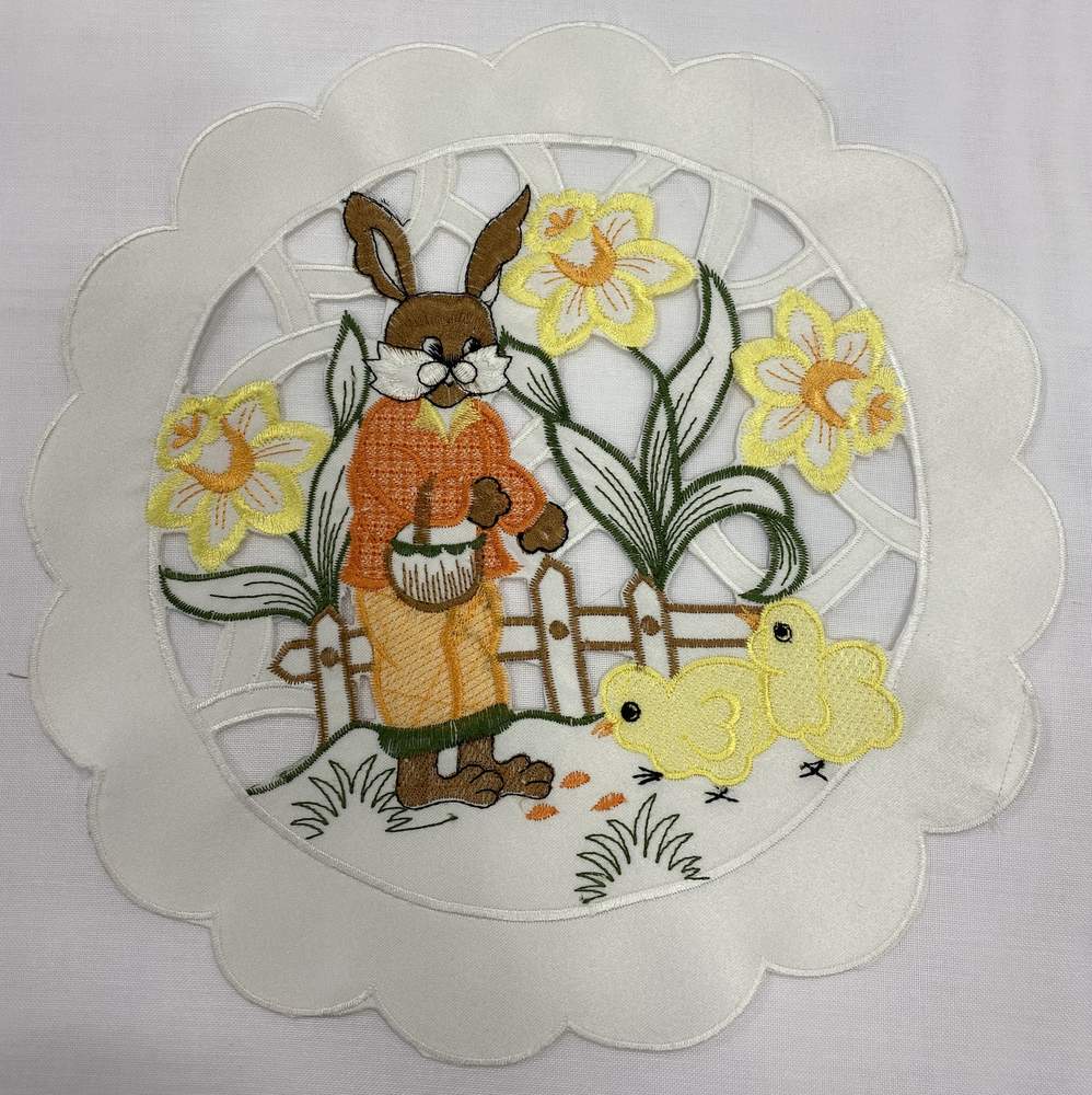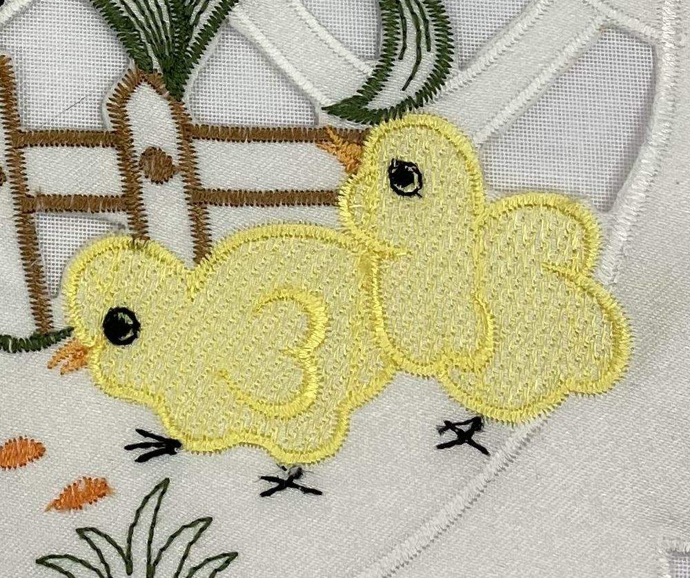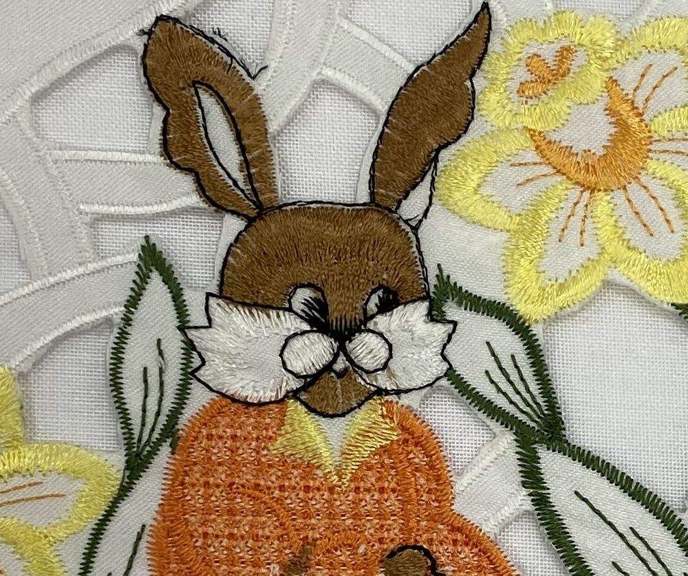 Velikonoční vyšívané prostírání, bílá barva s vyšívaným lemem, prostříhavané s aplikací zajíčka a kuřátek