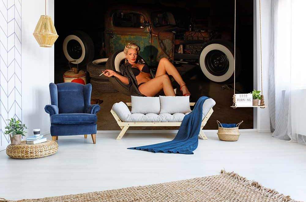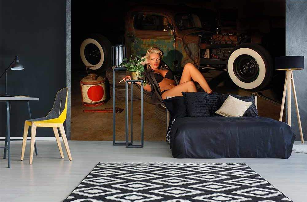 Vliesové fototapety MS-5-0311, fototapeta Girl in garage, 375 x 250 cm + lepidlo zdarma