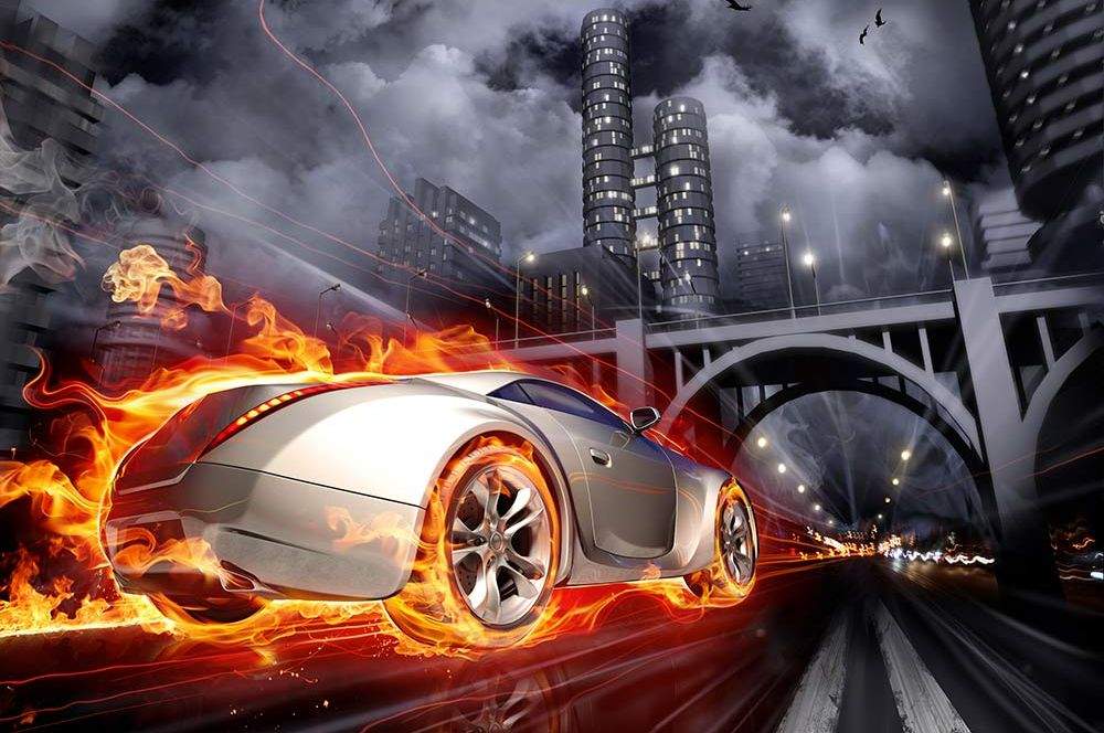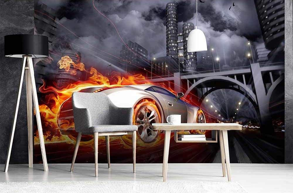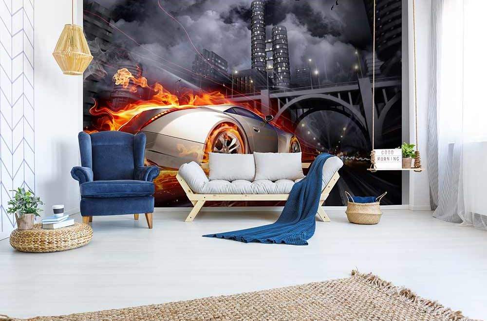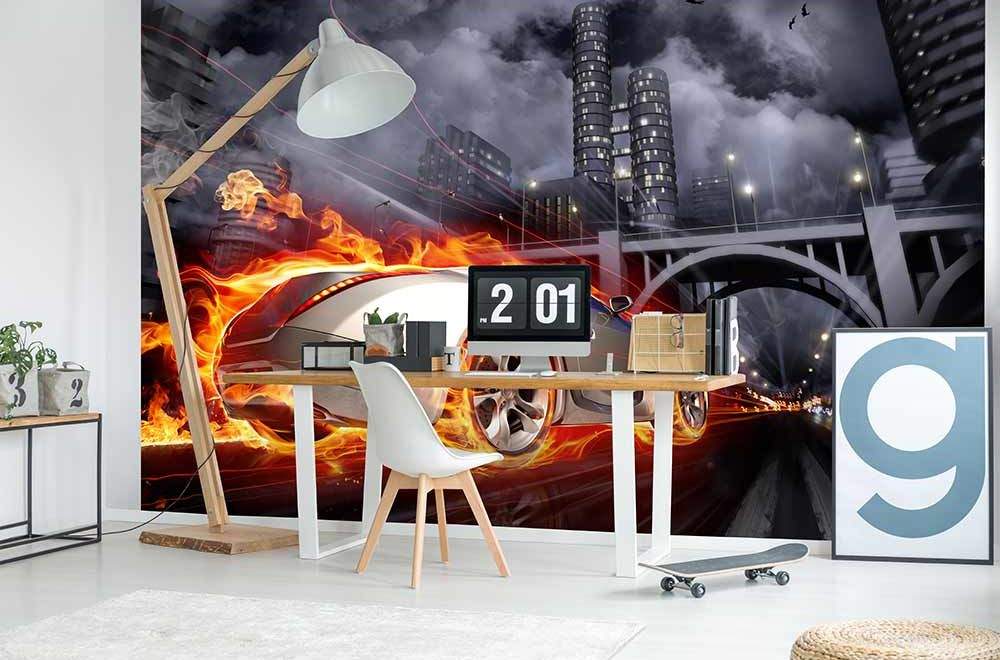 Vliesové fototapety MS-5-0314, fototapeta Car in flames, 375 x 250 cm + lepidlo zdarma
