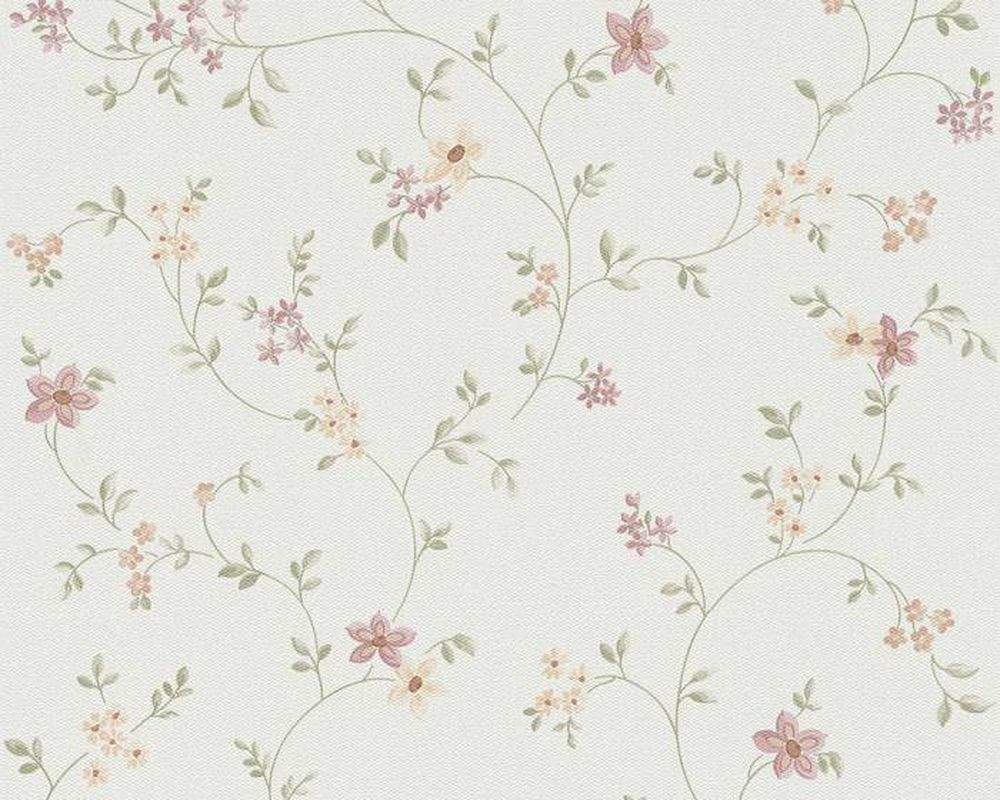 Moderní vliesová tapeta s květinovým vzorem, smetanová barva, fialové a světle oranžové květy, zelené listy, jemná struktura.