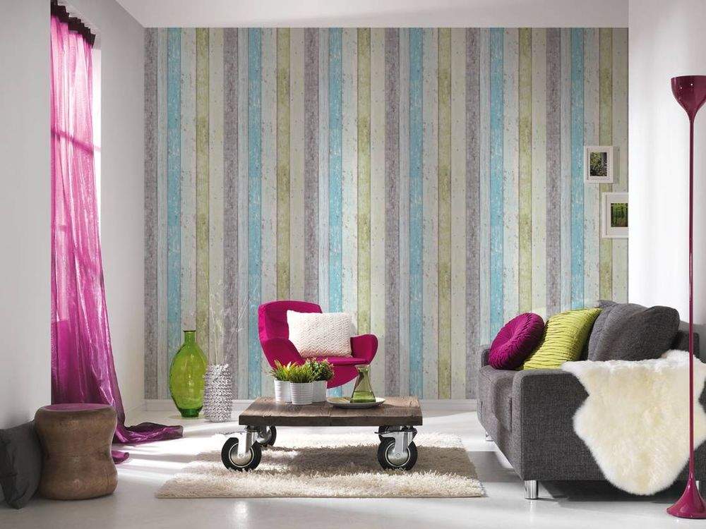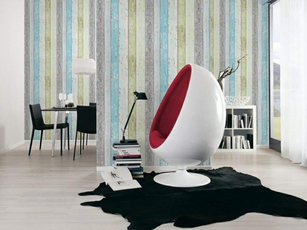 Moderní vliesová tapeta - imitace dřeva, modrá, zelená a béžová barva dřeva.