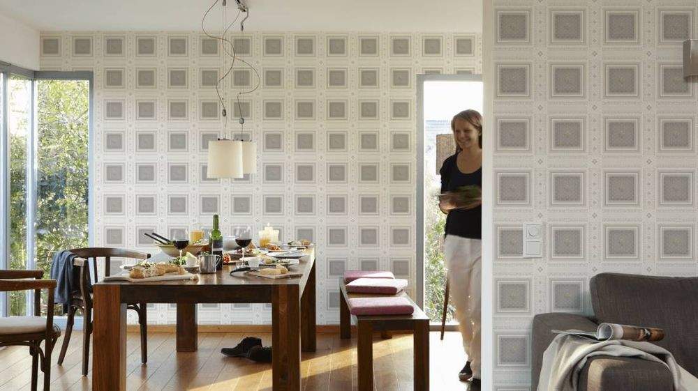 Ostatní vlastnosti:Barva tapety: smetanová, šedáKatalog: Hermitage 10 - 2023Prostřih: 26 cmVzor: kostky, ornamenty