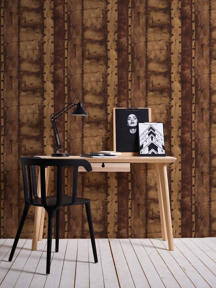 Ostatní vlastnosti:Barva tapety: hnědá, měděnáKatalog: Industrial 2023Prostřih: 0 cmVzor: pruhy, moderní