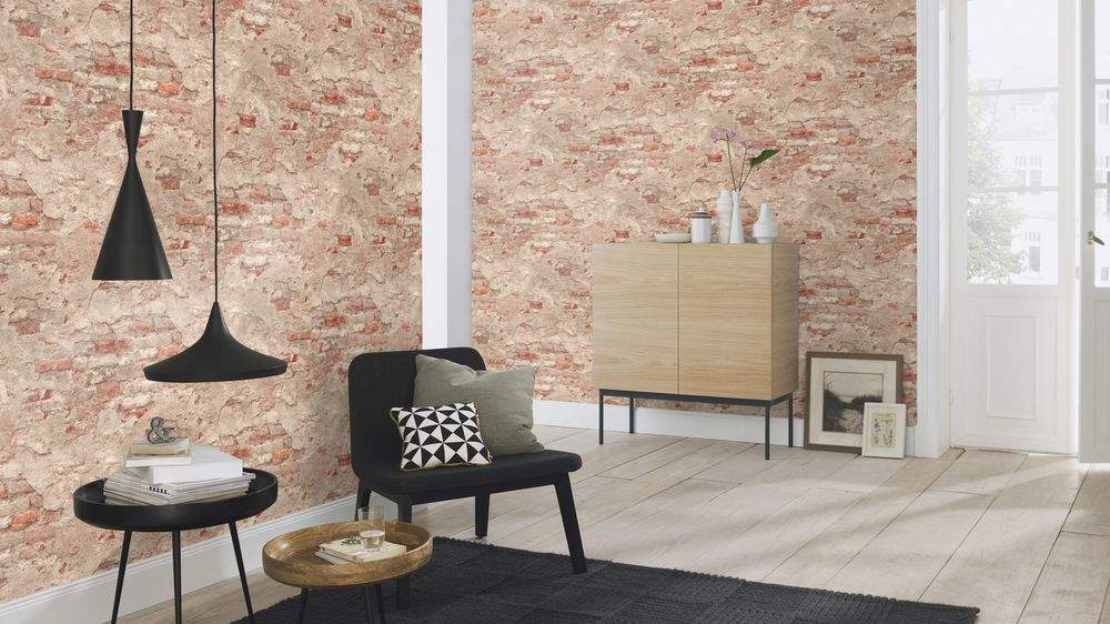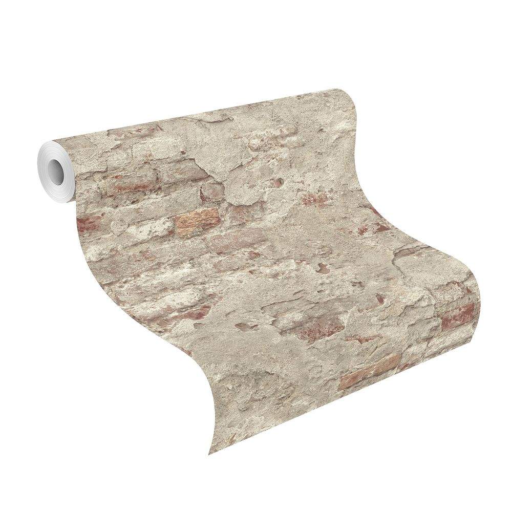 Moderní vliesová tapeta se vzorem z části přiznané omítky a cihlami, béžová a cihlová barva.
