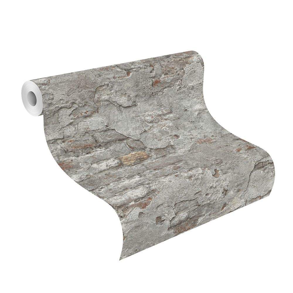 Moderní vliesová tapeta se vzorem z části přiznané omítky a cihlami, šedá a cihlová barva.