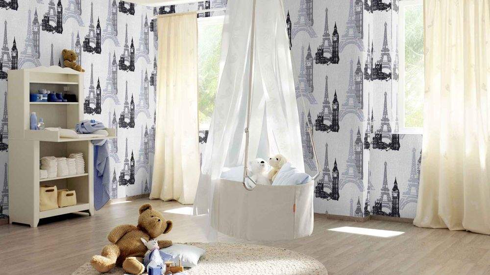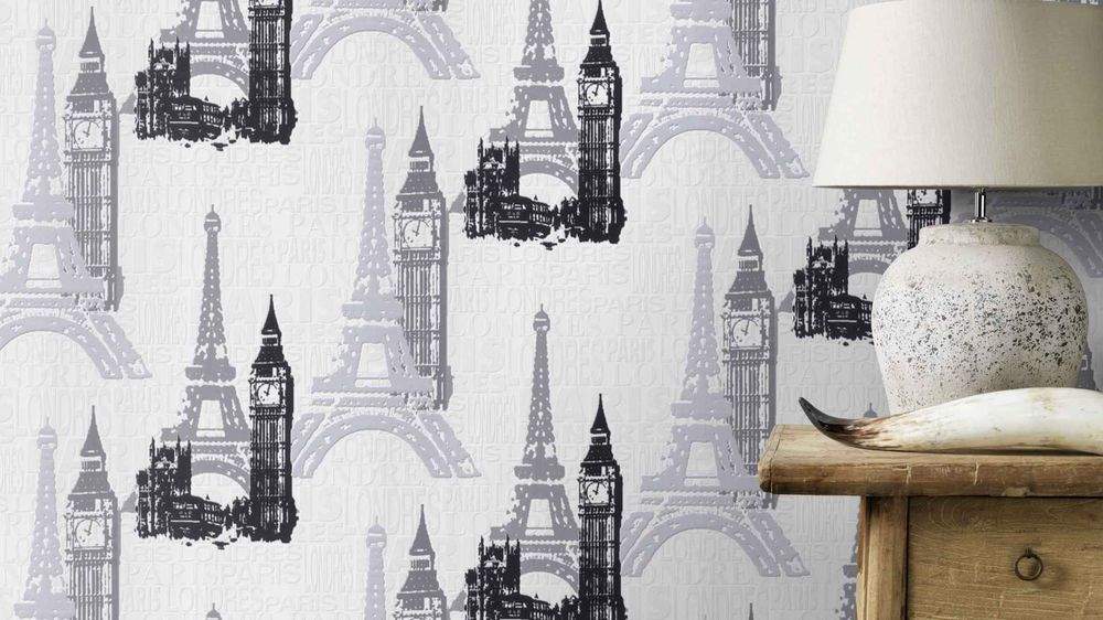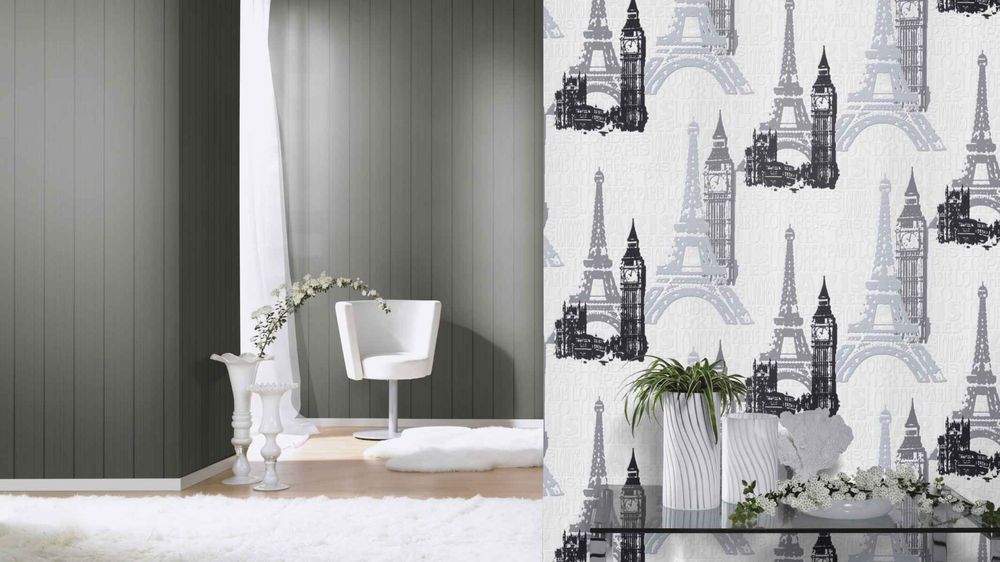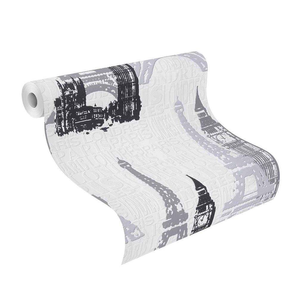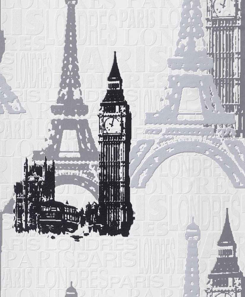 Moderní vliesová tapeta s motivy - bílý podklad a písmena, černé, šedé a stříbrné s leskem motivy Londýn a Paříž.