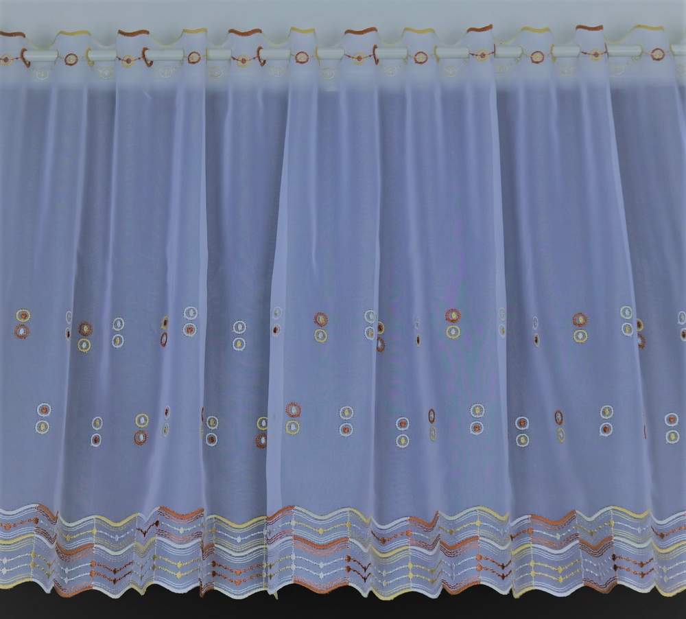Barva bílá, výšivka cihlové a zlatavé barvy, záclonu je možno objednat ve výšce 30cm, 60cm.