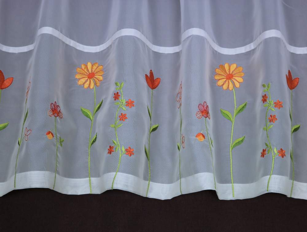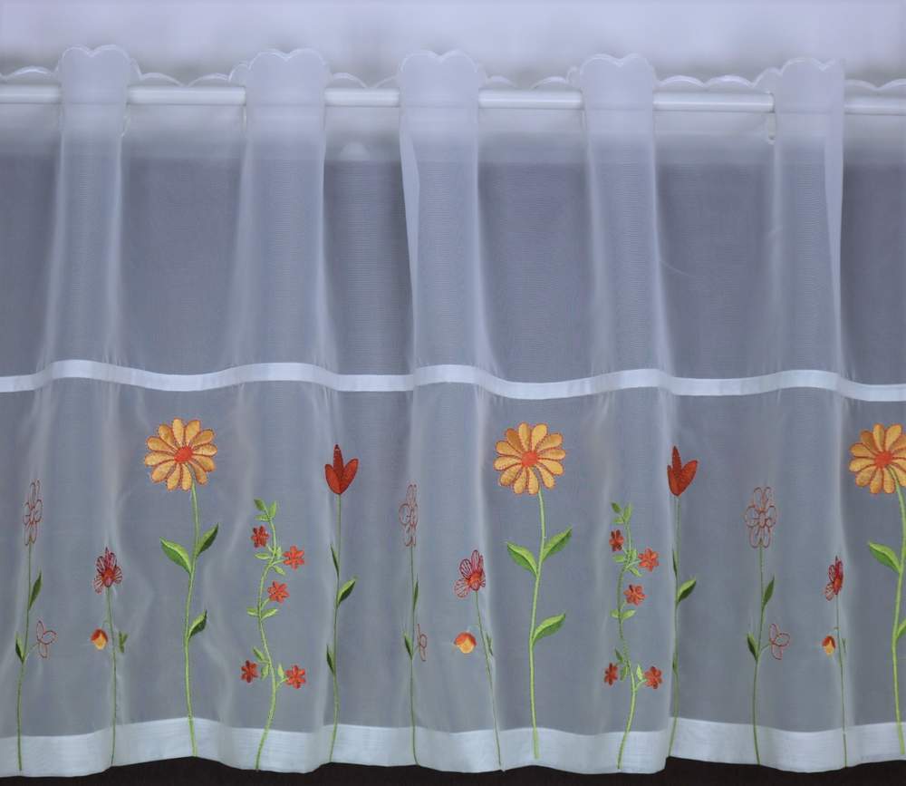 Moderní vyšívaná vitrážková záclona s očky na protažení tyčky.