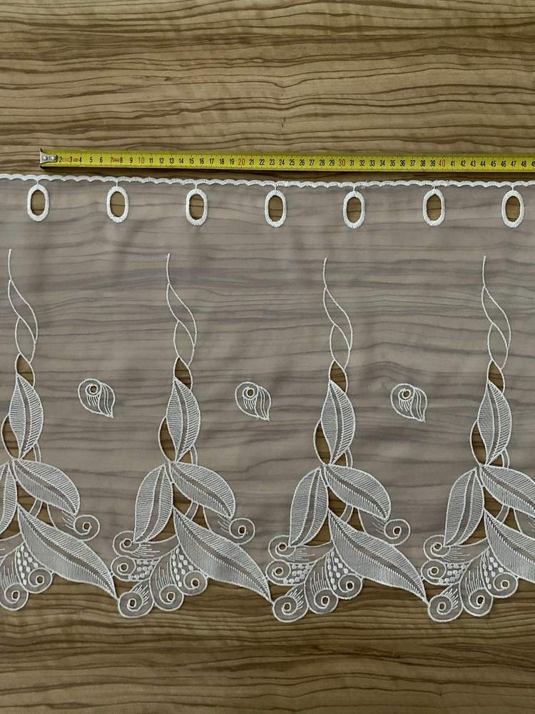 Luxusní vyšívaná a prostříhavaná vitrážková záclona s očky na protažení tyčky. Výška 45cm očka na tyčku 2cm.